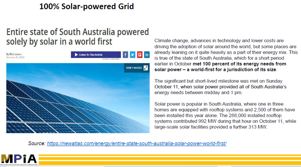 Chong presented the global trend in solar energy adoption and pointed out that in terms of energy transition, Australia with 25 million population had more than 2 million rooftops with solar systems while Malaysia with a population of 32 million had less than 20,000 buildings with rooftop solar systems. He said the potential for buildings that could adopt solar rooftop solutions in Malaysia included the 3.2 million residential houses, 450,000 shop houses, 110,000 factories, 1,000 shopping malls and 5,000 government buildings.