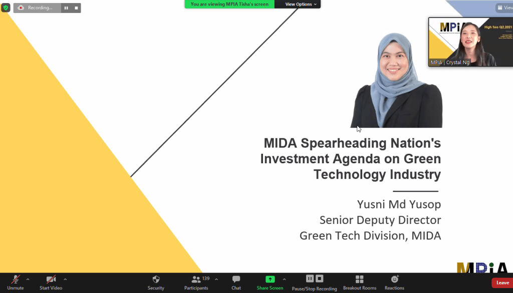 On 24 August 2021, the Malaysian Investment Development Authority’s (MIDA) Senior Deputy Director of Green Technology Division Yusni Md Yusop spoke at the MPIA High Tea, which was held online.