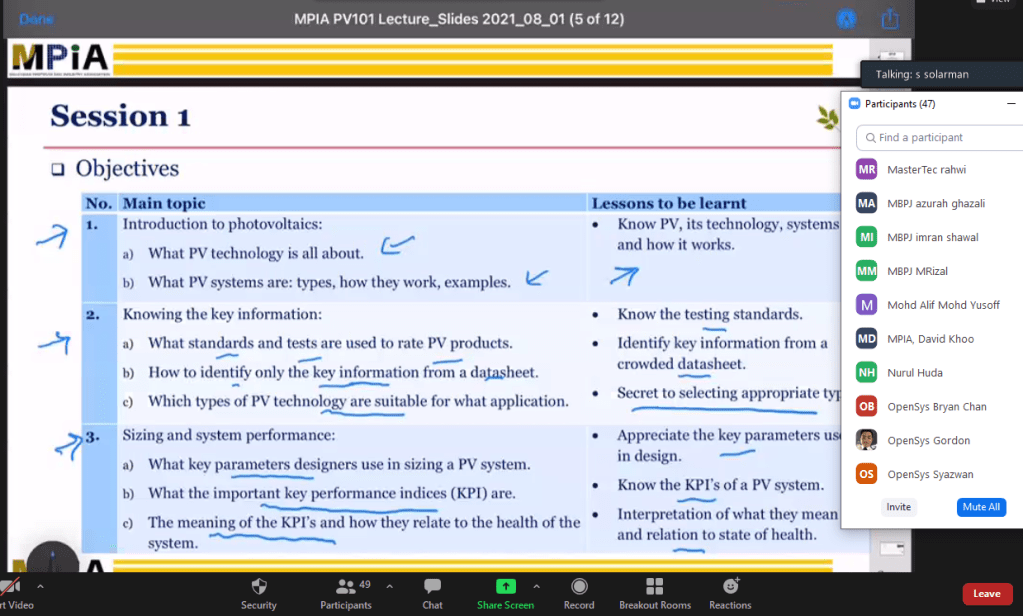 MPIA’s training course General Introduction to Photovoltaic Systems (code-named PV101) officially took off on 3 August 2021, with the first session conducted by MPIA Master Trainer Prof. Sulaiman Shaari.