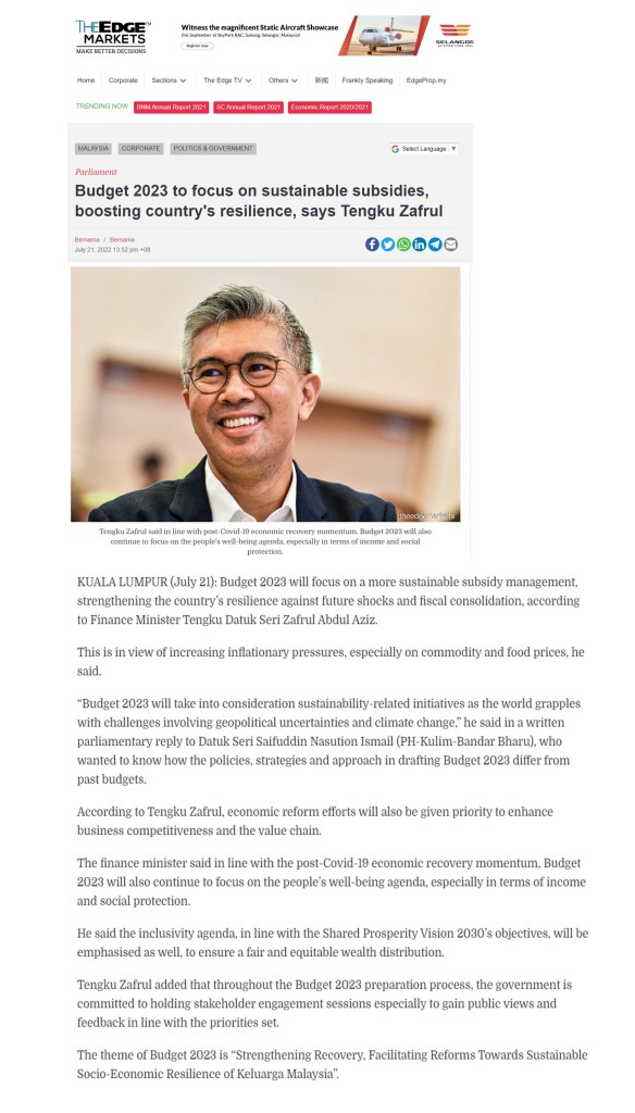 August 23, 2022silawatimpiaLeave a Comment on Budget 2023 to focus on sustainable subsidies, boosting country’s resilience Budget 2023 to focus on sustainable subsidies, boosting country’s resilience 21 July 2022 Credit to : The Edge Markets Link : http://www.theedgemarkets.com/article/budget-2023-focus-sustainable-subsidies-boosting-countrys-resilience-says-tengku-zafrul#.YwQv5wa3NOo.whatsapp Share this: Share on X (Opens in new window) X Share on Facebook (Opens in new window) Facebook Like Loading... Related