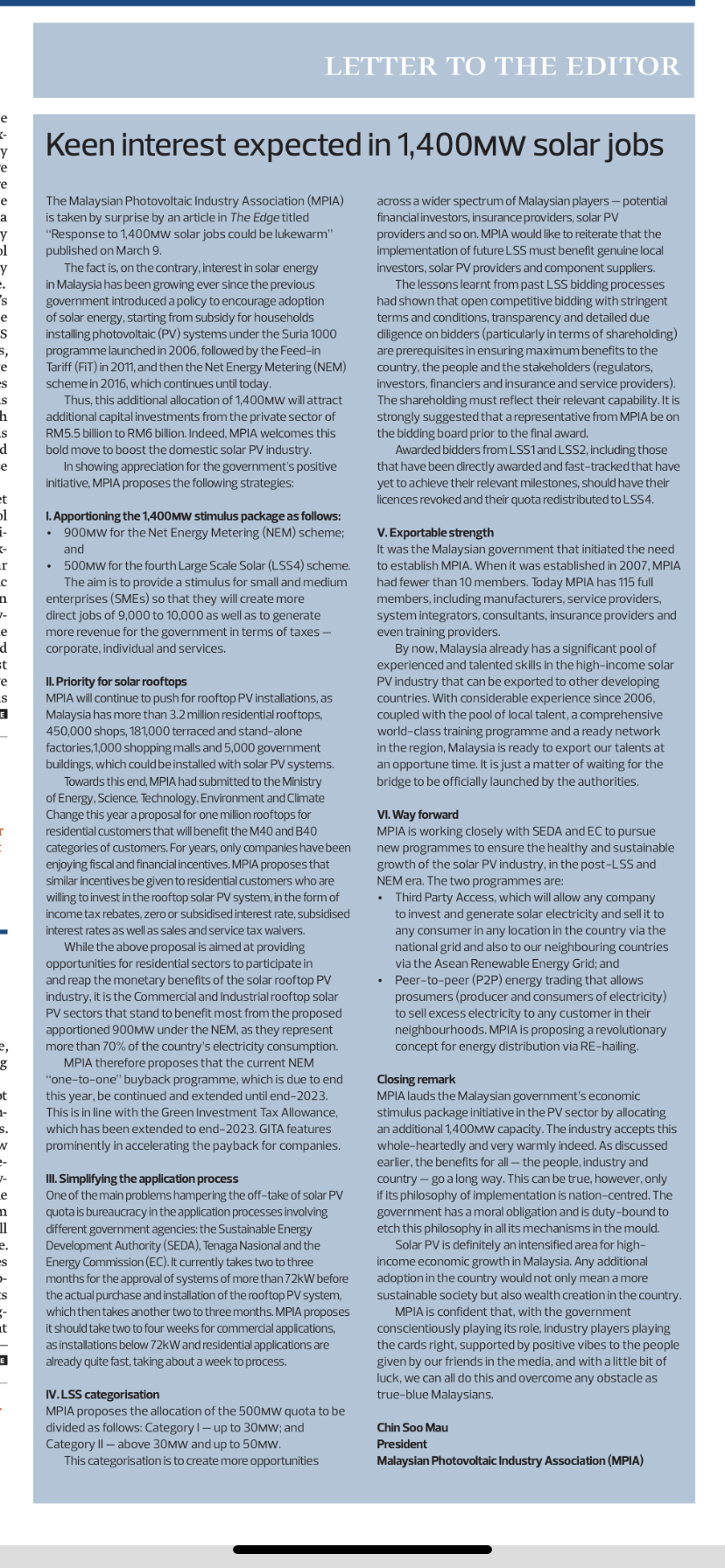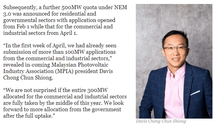 “In the first week of April, we had already seen submission of more than 100 MW applications from the commercial and industrial sectors. We are not surprised if the entire 300 MW allocated for the commercial and industrial sectors are fully taken by the middle of this year. We look forward to more allocation from the government after the full uptake,” Chong told.