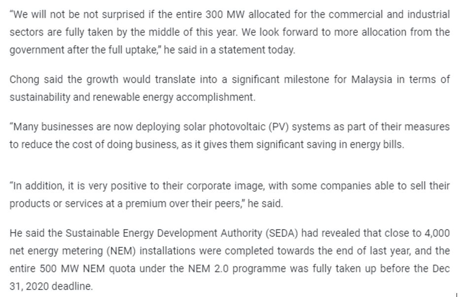 According to Chong, SEDA announced that nearly 4,000 NEM plants were completed late last year and the entire NEM quota of 500 MW was fully exhausted last year before the December deadline was reached. A further 500 MW quota was then announced as part of NEM 3.0.