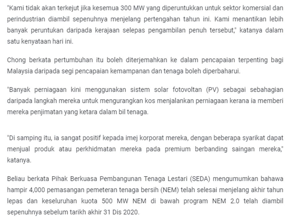 “Kami tidak akan terkejut jika kesemua 300 MW yang diperuntukkan untuk sektor komersial dan perindustrian diambil sepenuhnya menjelang pertengahan tahun ini. Kami menantikan lebih banyak peruntukan daripada kerajaan selepas pengambilan penuh tersebut,” katanya dalam satu kenyataan pada Isnin.