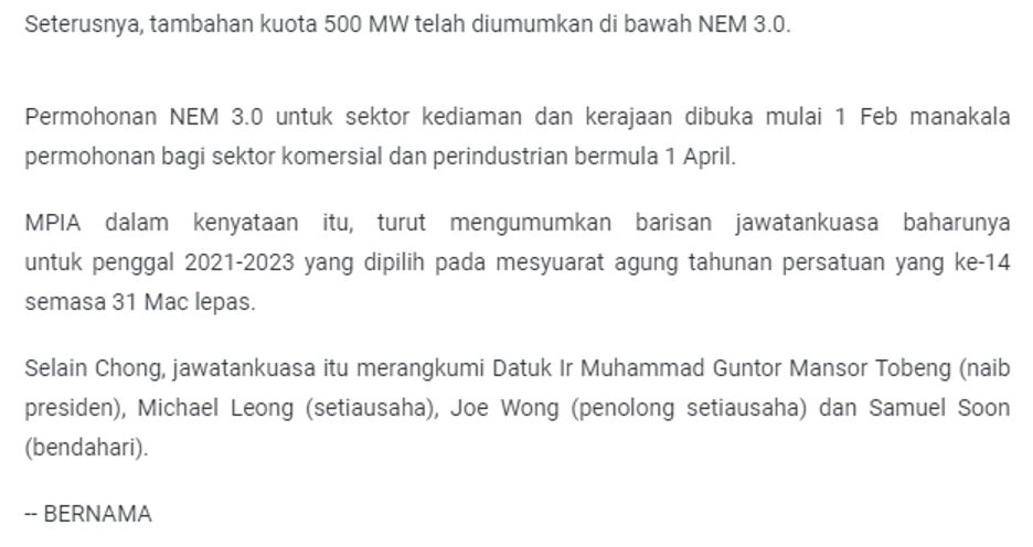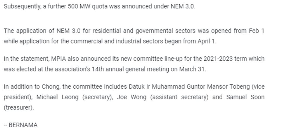 Seterusnya, tambahan kuota 500 MW telah diumumkan di bawah NEM 3.0.