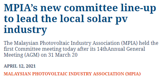 The Association of the Malaysian Photovoltaic Industry (MPIA) held the first committee meeting today after its 14th annual general meeting on March 31, 2021, in which the new committee list for the 2021-2023 term of office was elected as follows: