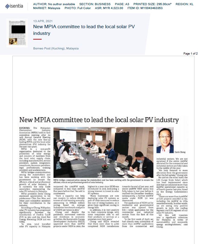 The Malaysian Photovoltaic Industry Association (MPIA) held the first Committee meeting today after its 14th Annual General Meeting (AGM) on 31 March 2021, which elected the new Committee line-up for term 2021-2023 as follows: