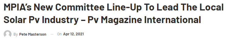 energy and consists of members from the local solar supply chain, including manufacturers, service providers, system integrators, consultants, insurance providers, legal professionals, training providers and academicians. – April 12, 2021
