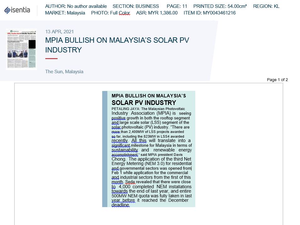 Established in 2006, MPIA is a non-profit organisation that represents the local solar industry. It has almost 150 members, including manufacturers, service providers, system integrators, consultants, insurance providers, training providers and academicians.